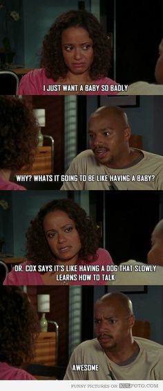 It’s the scene from Scrubs where Carla tells Turk that Dr. Cox says having a baby is “like having a dog that slowly learns how to talk.” Here to help.